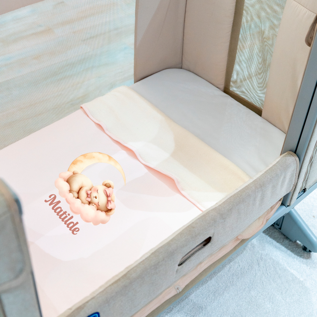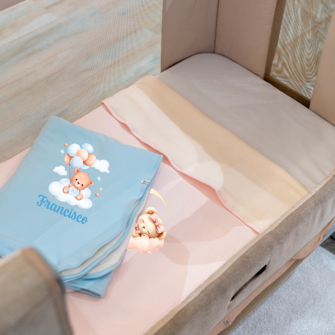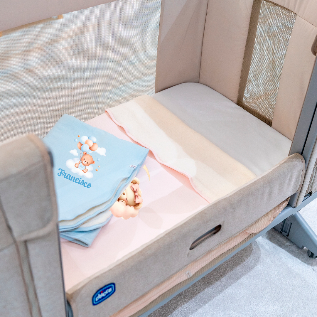 Personalizado com o nome do bebé e um design delicado, é o companheiro ideal para o berço, alcofa, carrinho ou para aqueles momentos de colo que aquecem o coração.