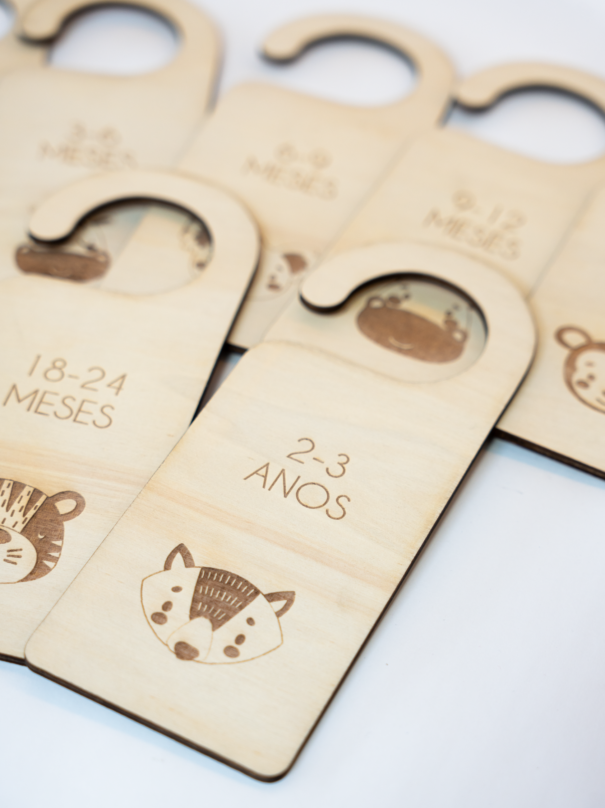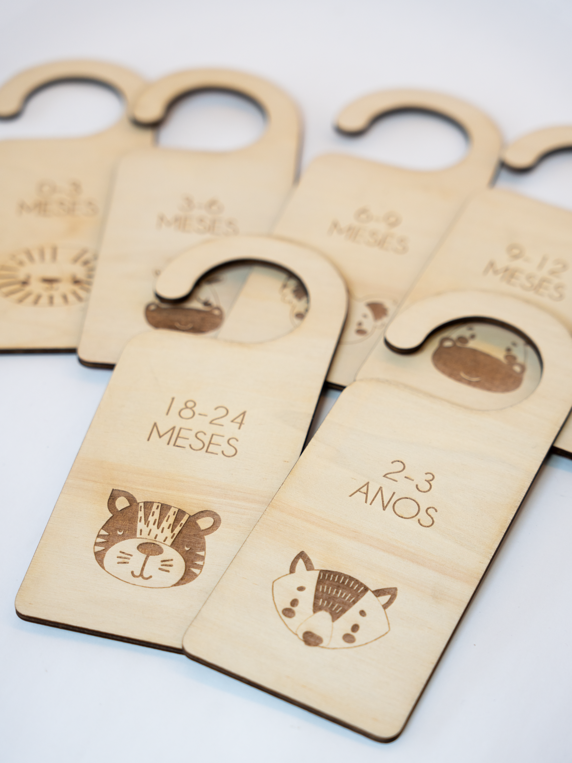 Estes organizadores de roupa em madeira natural são perfeitos para manter o roupeiro do bebé sempre organizado por idades — do 0-3 meses até aos 2-3 anos.