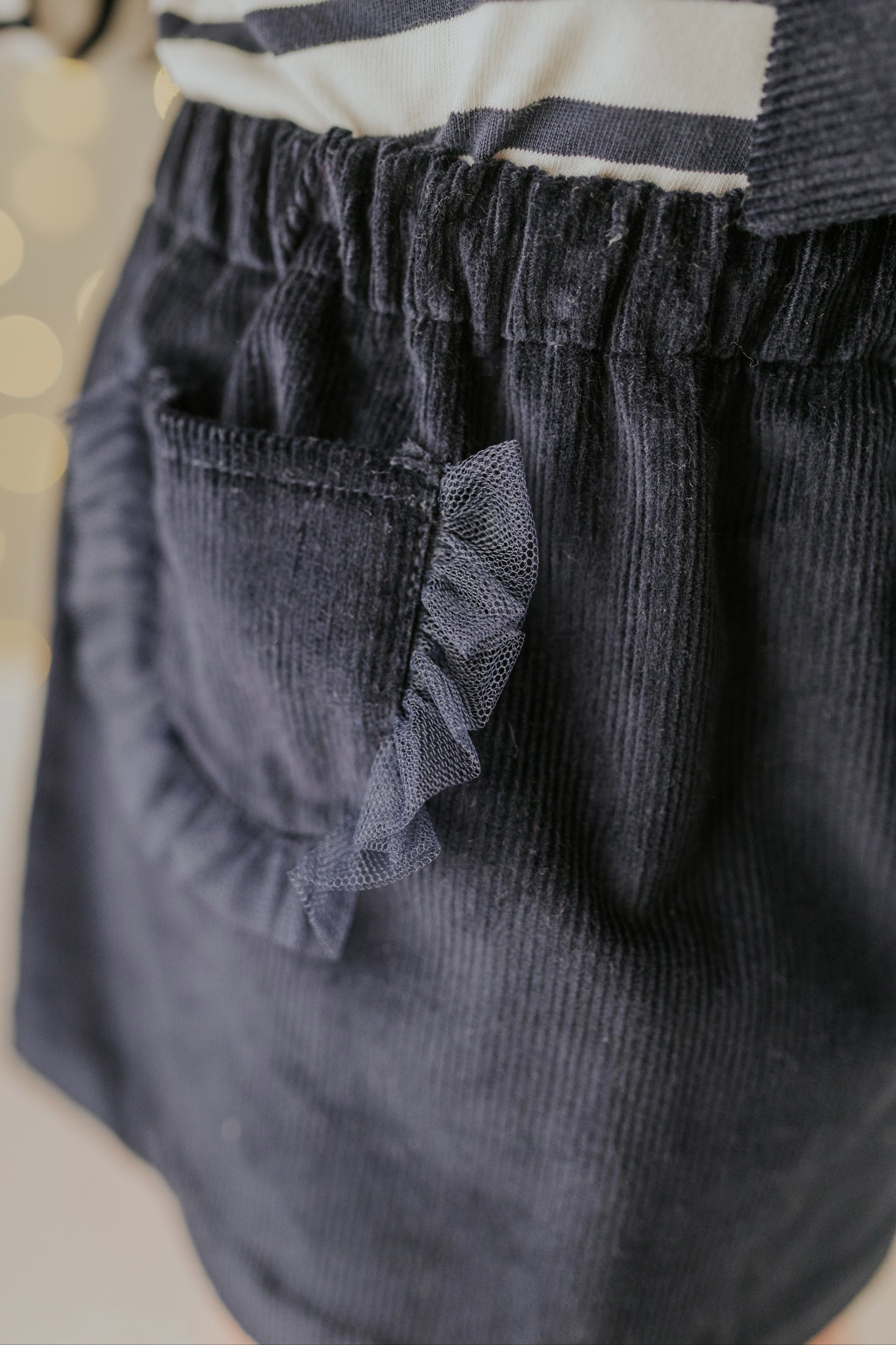 Confectionnée en velours côtelé bleu marine doux, cette jupe renferme une touche de magie : de délicats volants de tulle évoquant des nuages de rêve. Chaque détail a été soigneusement pensé pour enchanter, de la douceur du tissu à la légèreté du mouvement, qui invite à la danse et à l’imagination d’histoires d’hiver.