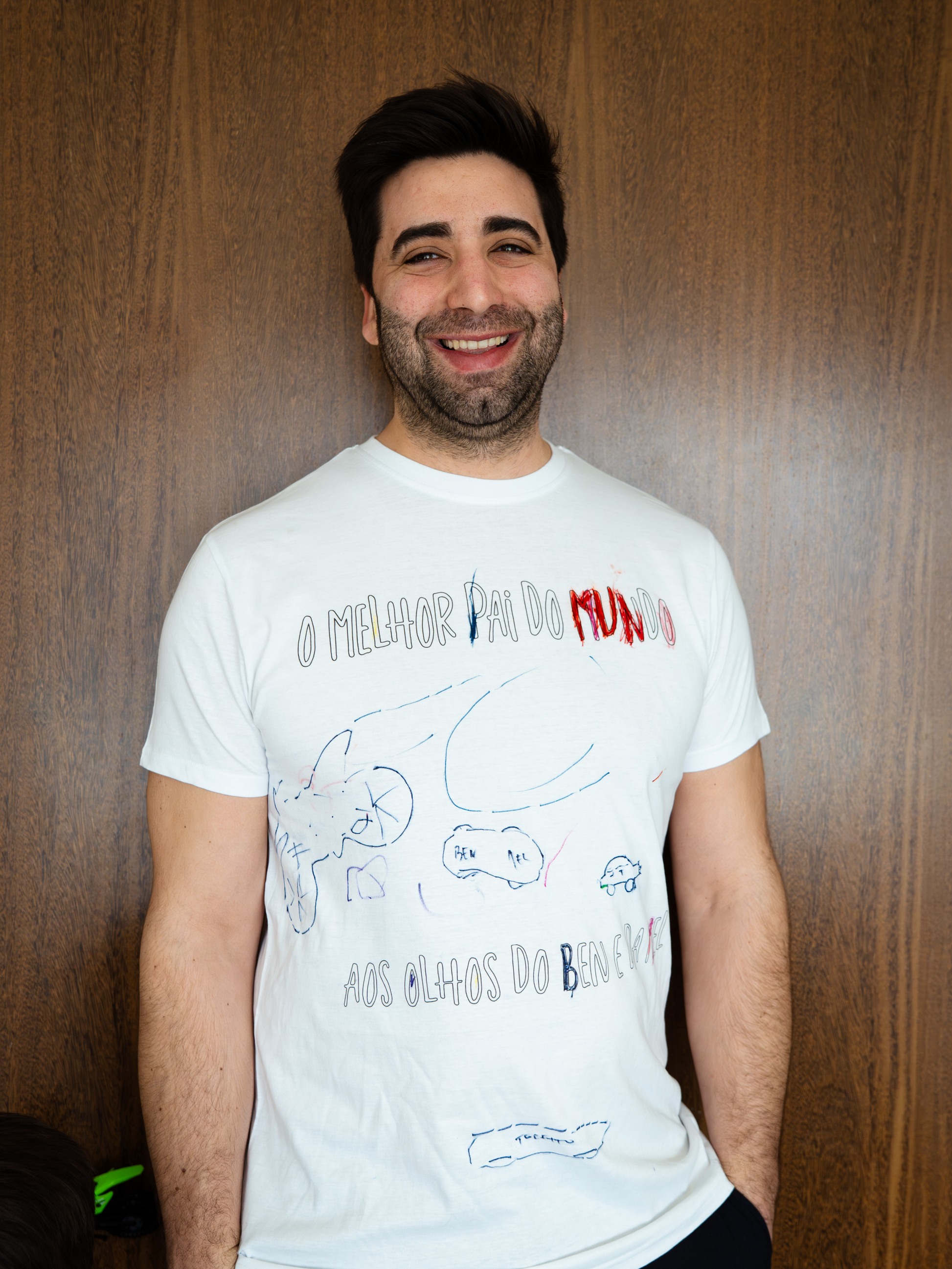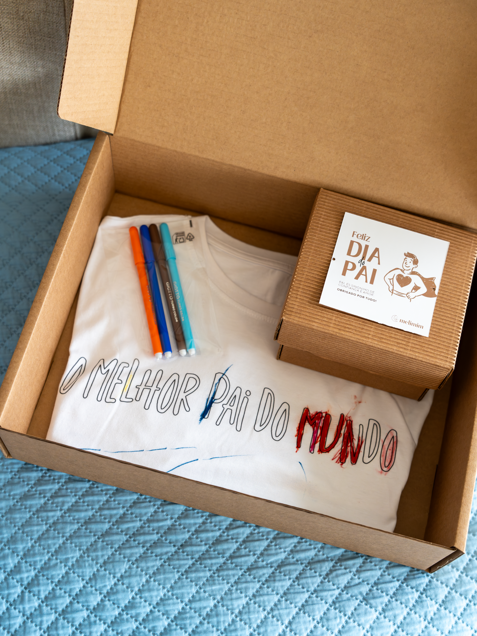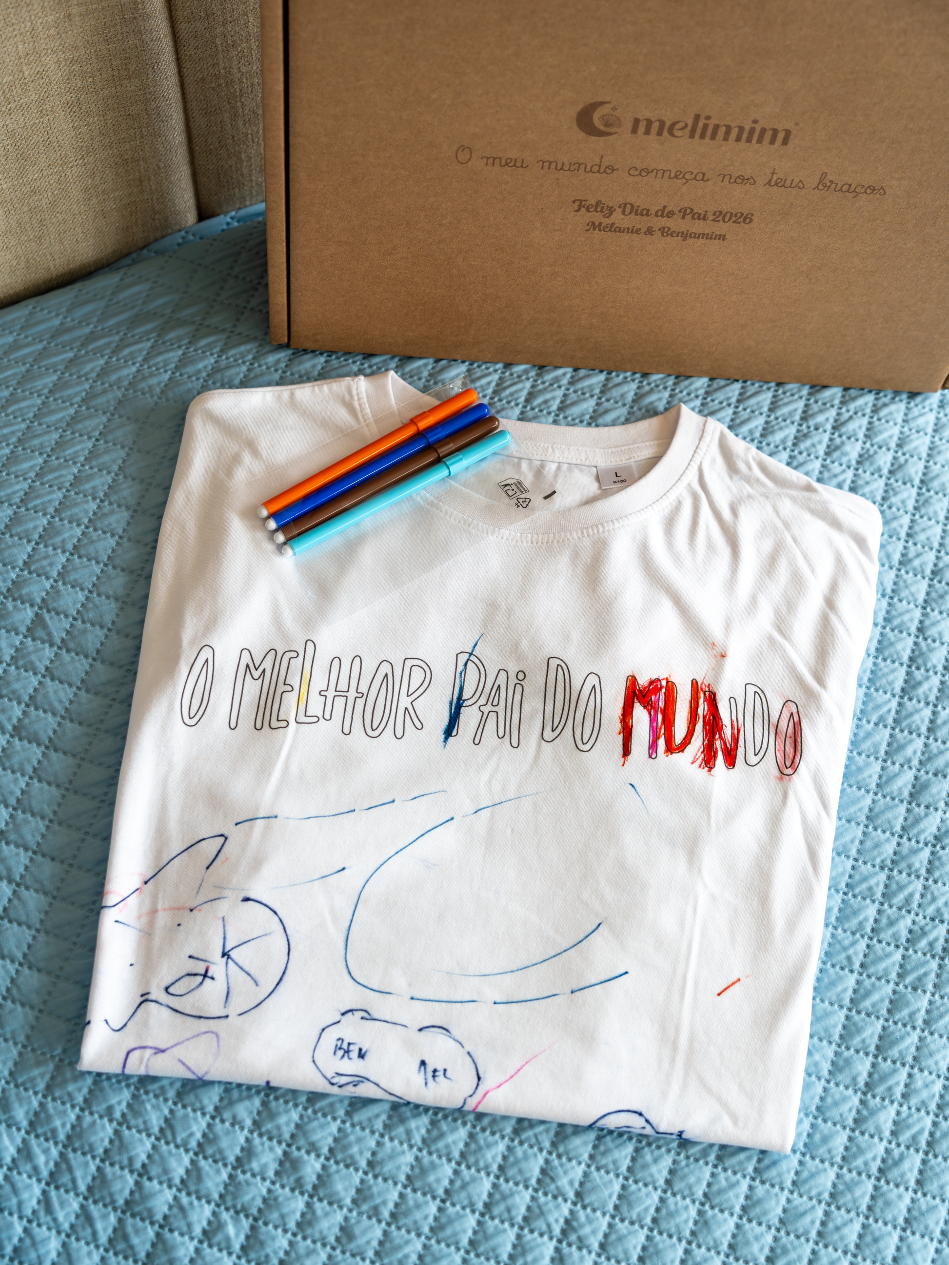 Os filhos desenham livremente na t-shirt — com rabiscos, corações, mensagens ou arte abstrata cheia de amor — e criam uma peça única, feita exclusivamente para o Pai.