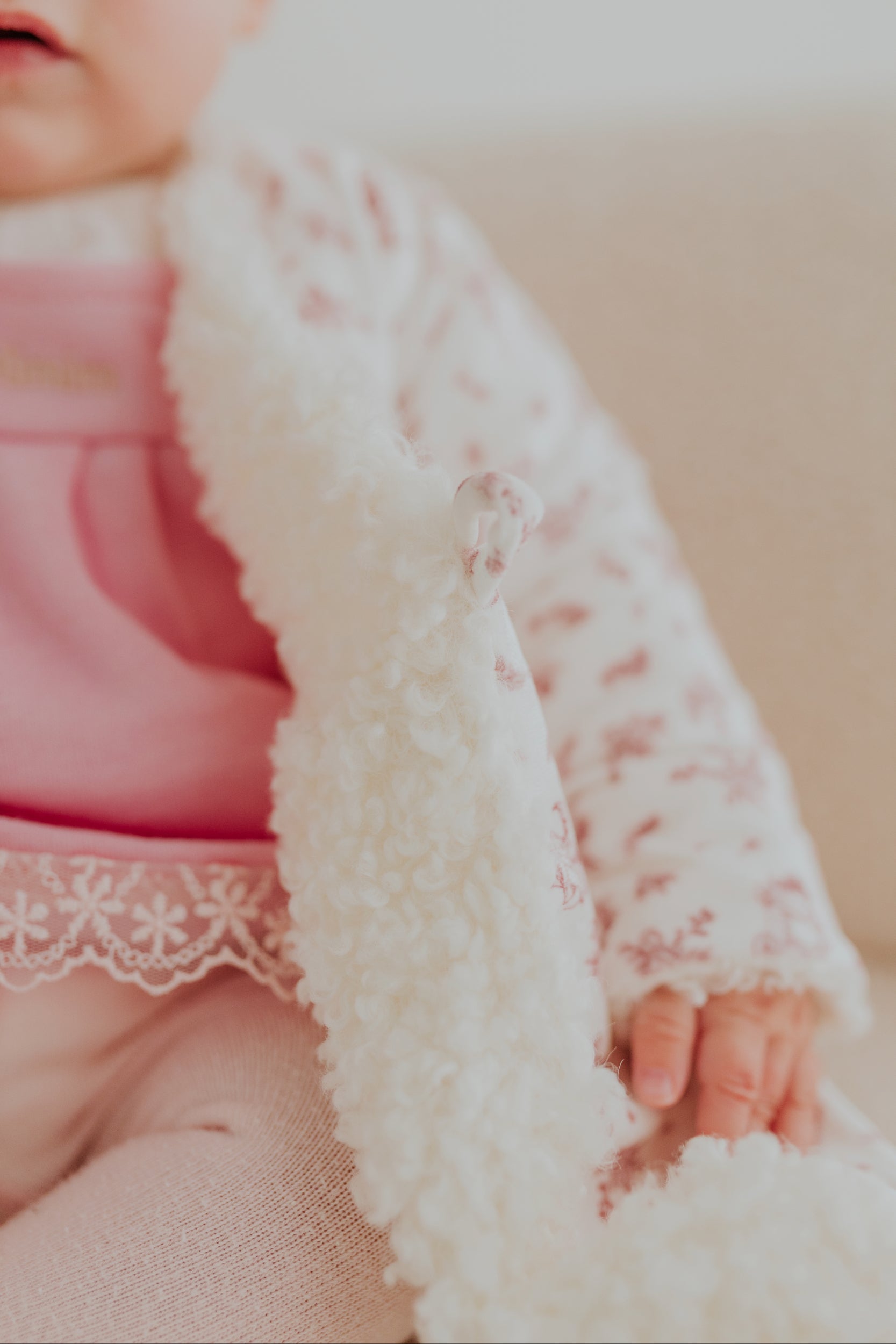 Um casaco, duas histórias: de um lado, o conforto quentinho do pelo suave, que abraça a menina como um carinho aconchegante; do outro, um tecido com um tema encantado que transforma cada dia numa aventura de conto de fadas.