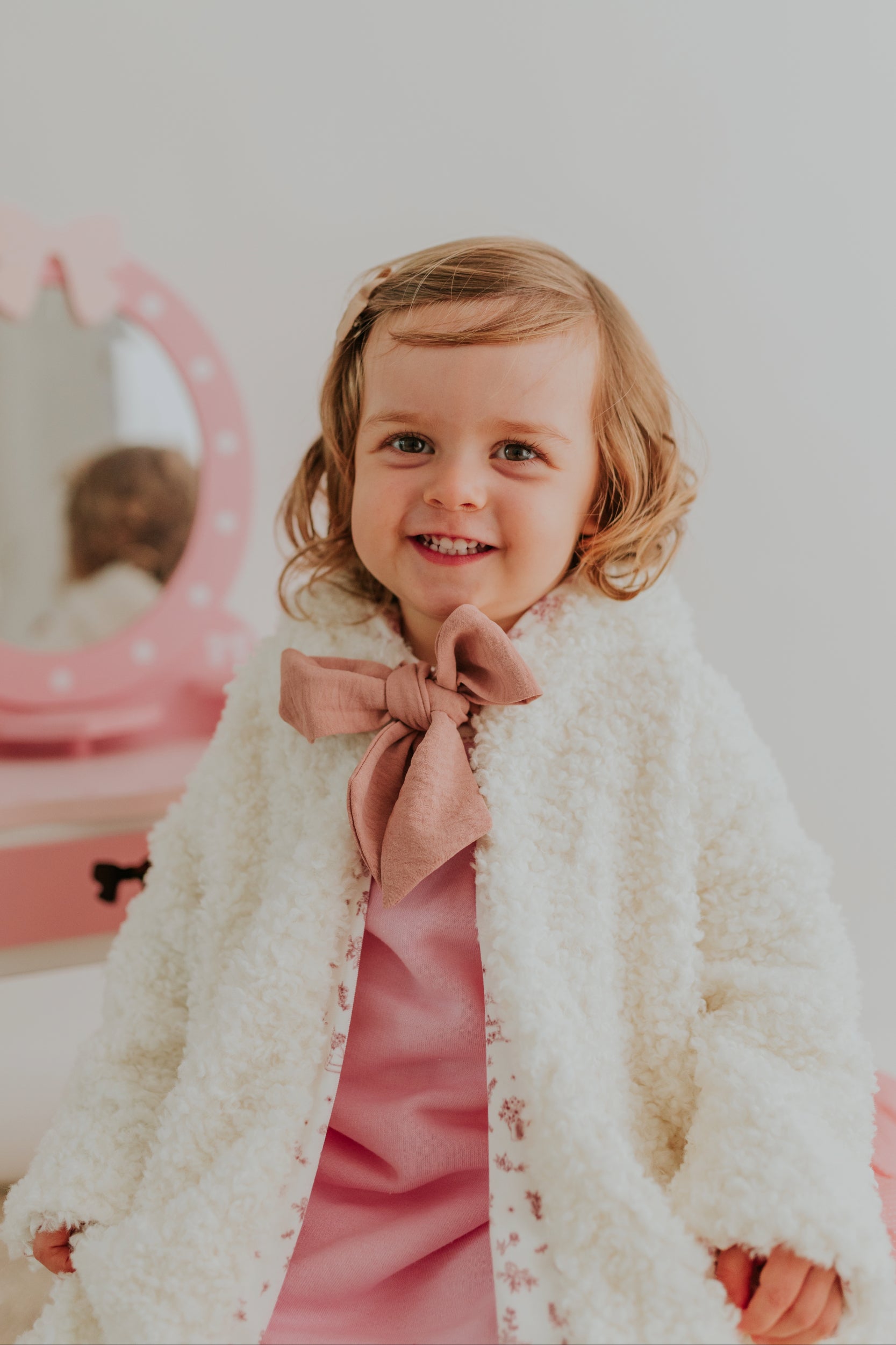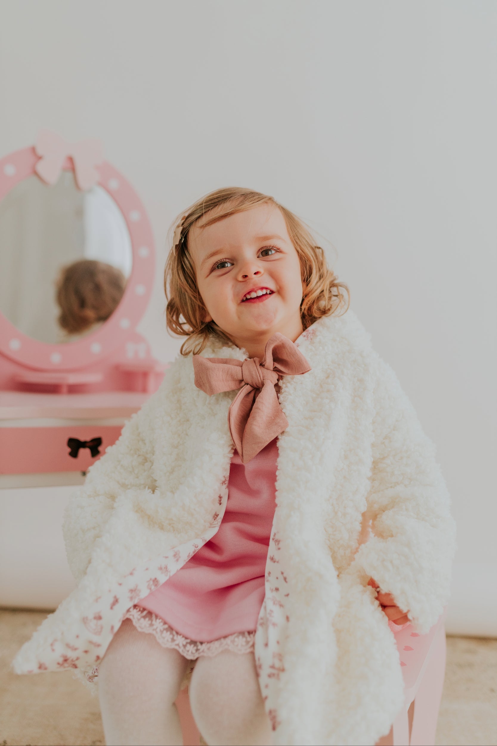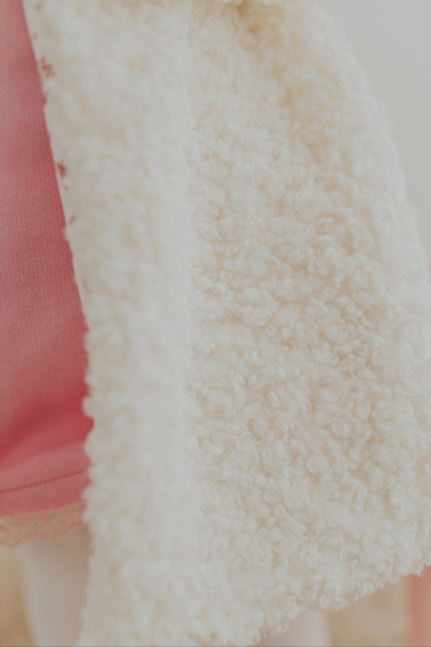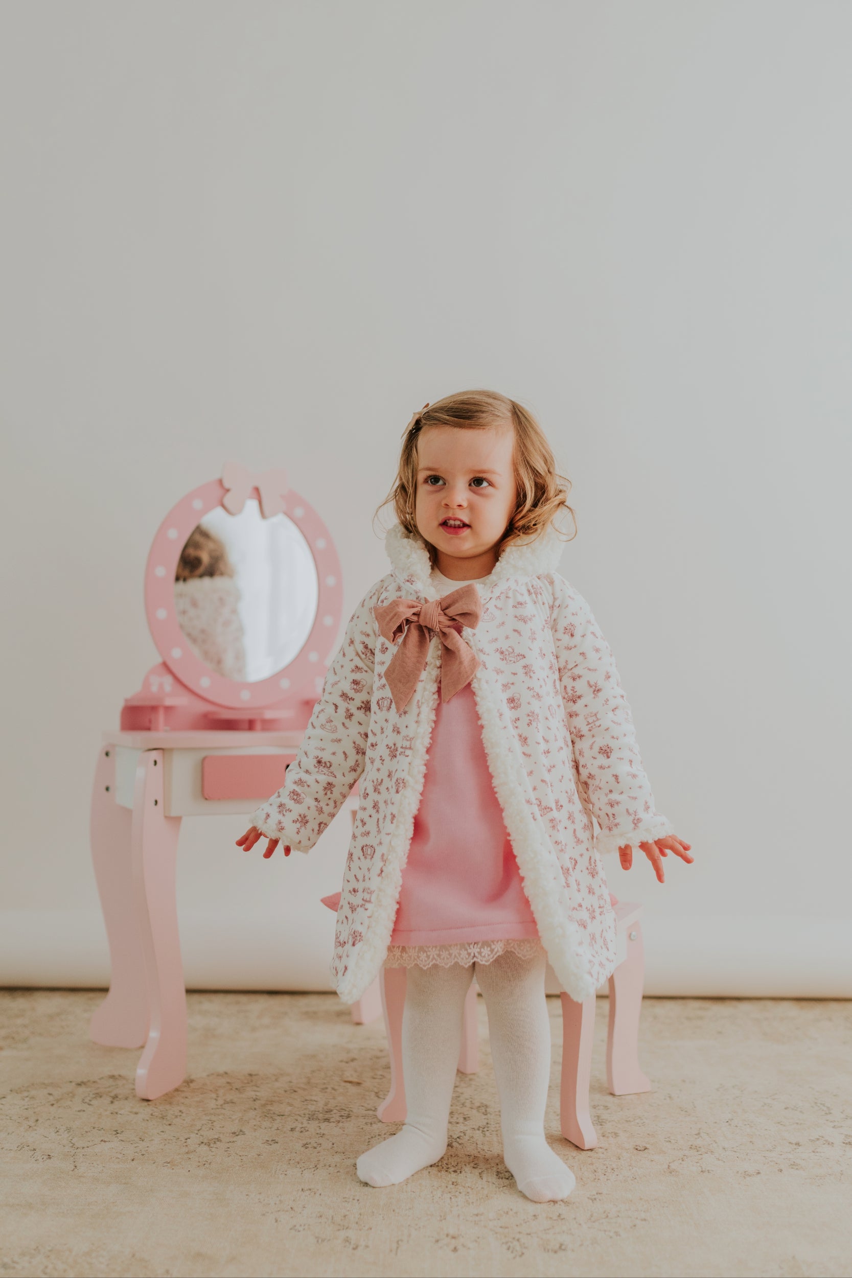 Um casaco, duas histórias: de um lado, o conforto quentinho do pelo suave, que abraça a menina como um carinho aconchegante; do outro, um tecido com um tema encantado que transforma cada dia numa aventura de conto de fadas.