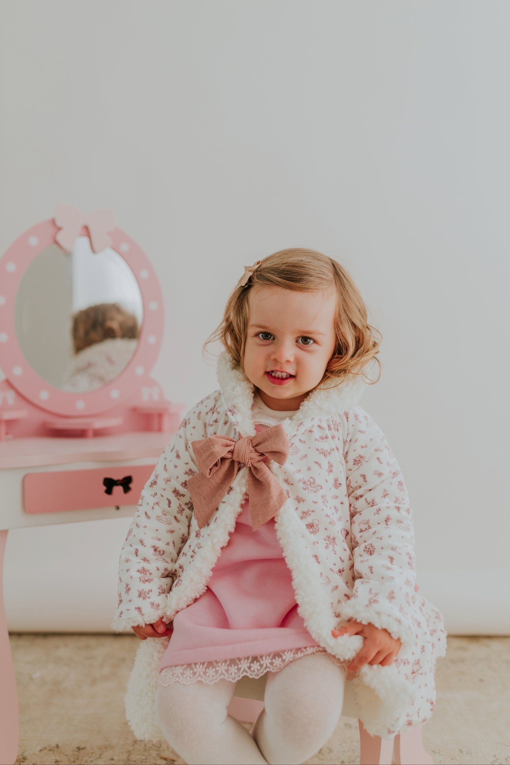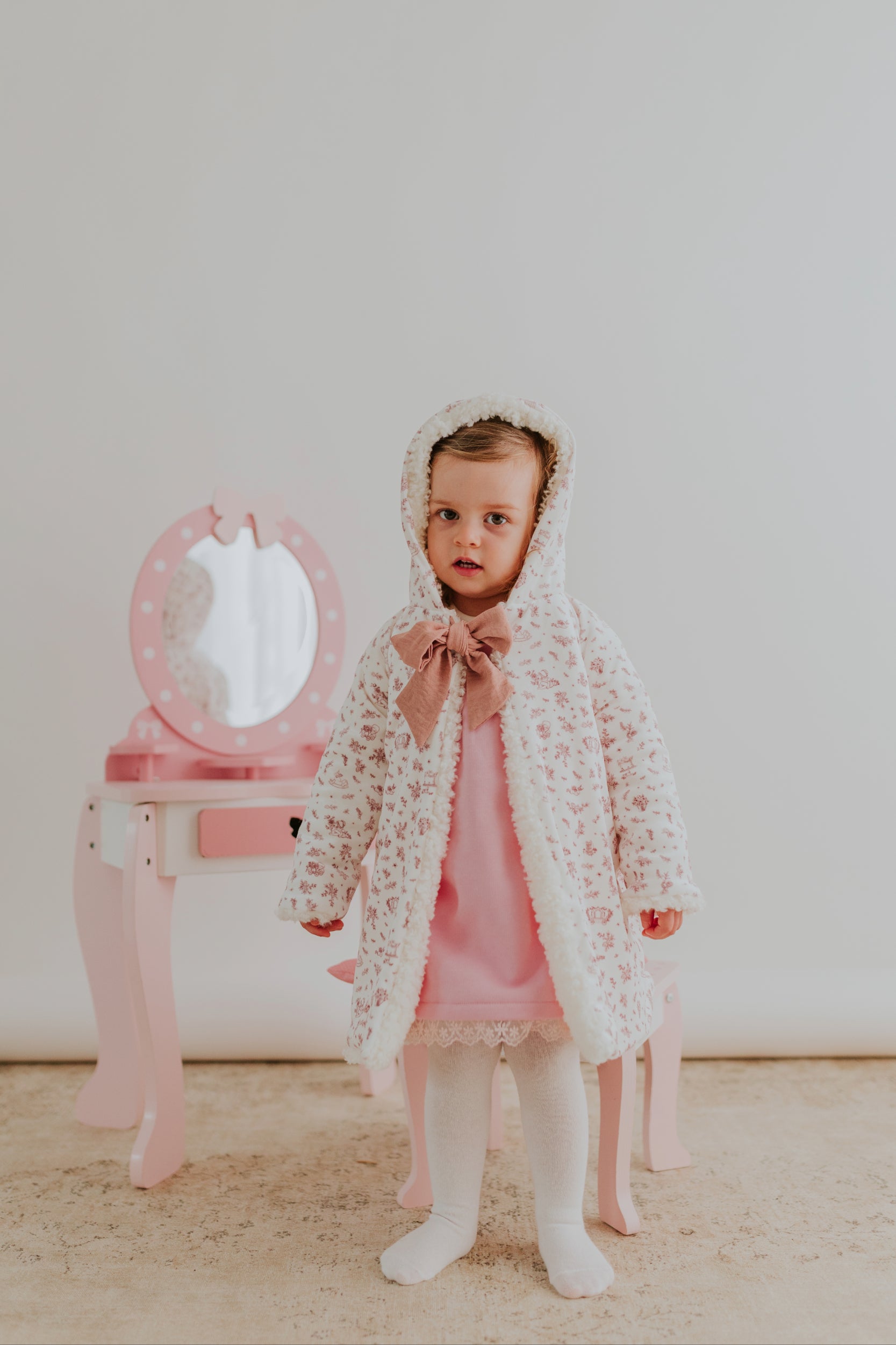 Versátil e cheio de charme, este casaco reversível permite que pequenas sonhadoras escolham como querem viver a magia — entre abraços de ternura ou passeios por florestas imaginárias, estrelas e criaturas fantásticas sempre por perto.
