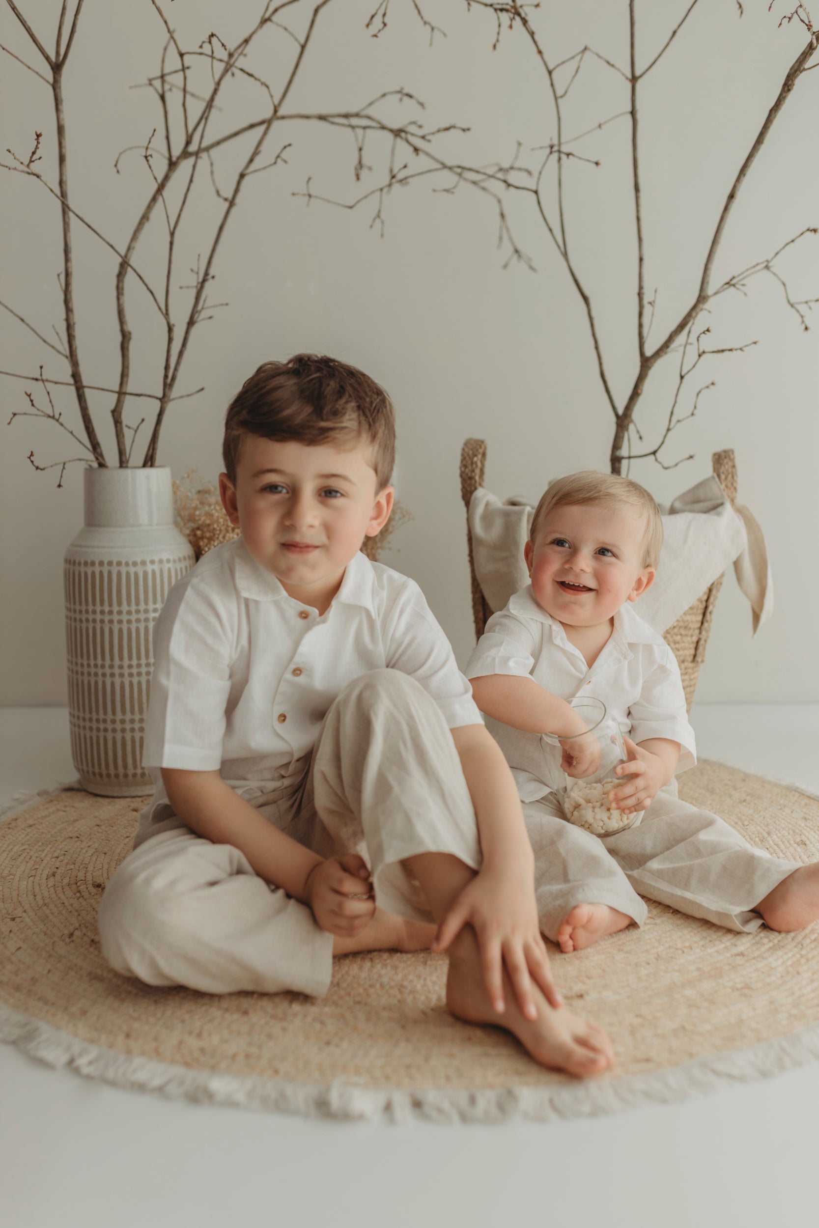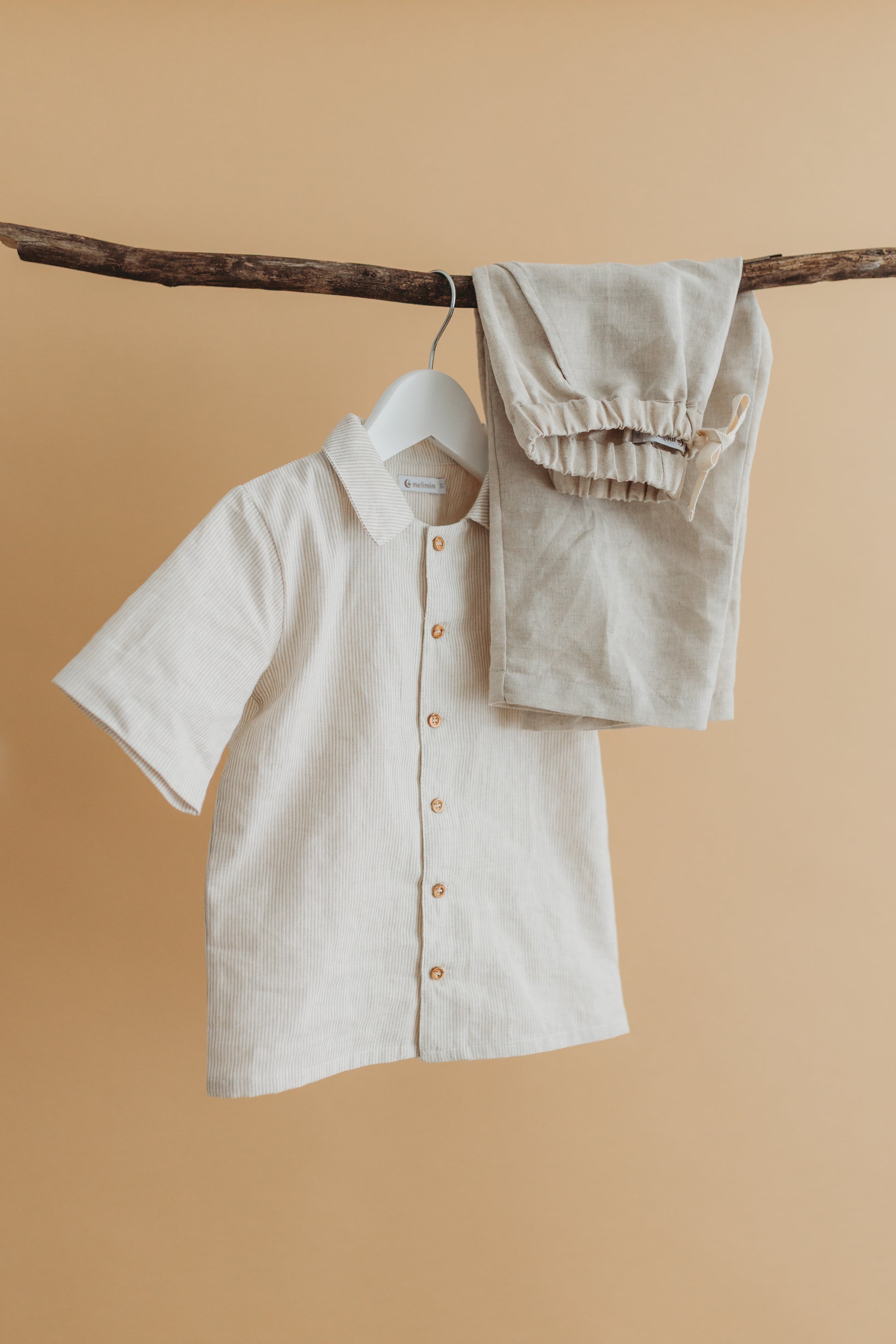 Calças com cintura ajustável e camisa com botões em madeira.