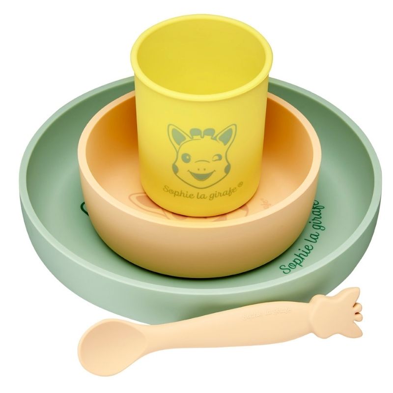 Este é um conjunto de utensílios de comida especialmente concebidos para bebés e crianças pequenas. Este conjunto infantil, composto por um prato, uma tigela, um copo e uma colher, é fabricado com silicone 100% seguro e macio, tornando-o uma opção ideal para a alimentação dos mais pequenos.